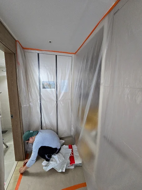 공사전 먼지 방지를 위한 보양 작업을 하며, 타일 재단등의 그라인더 작업은 복도 계단에서 고성능 집진기를 사용해 2인이 같이 작업하고 있습니다. 공구도 가급적 복도에 두고 필요한 것만 반입, 반출하여 집의 오염이나 손상을 일체 일어나지 않게 하고 있습니다.