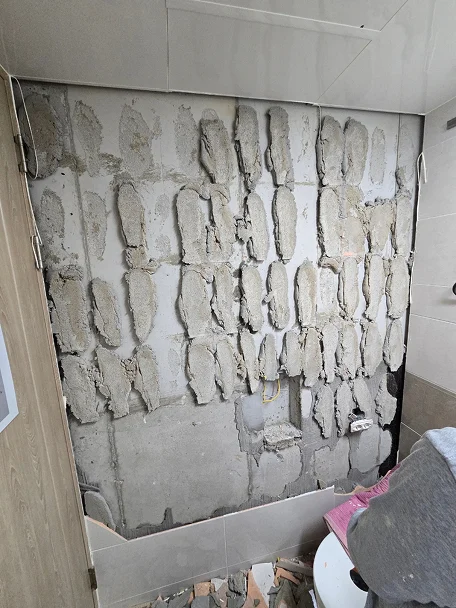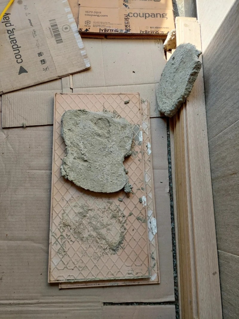 결론만 말씀드리면 극히 낮은 조건의 확률이 충족되어야 타일 재사용이 가능합니다. 4번 항목에서 설명했듯이 하자의 80%는 벽체의 몰탈이 탈락되어 발생하는 문제이기 때문에 타일을 철거하게 되면 아래의 사진과 같이 떨어지는 경우가 많습니다.