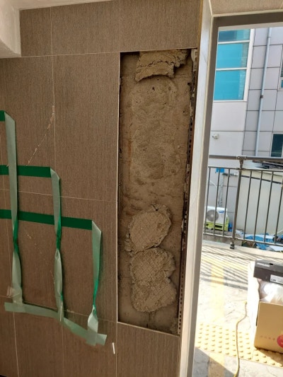 다수의 타일 하자 보수 공사를 진행해본결과 하자의 80% 이상은 시멘트 벽체와 타일을 붙일때 접착 재료로 사용하는 몰탈 (시멘트, 모래, 물의 혼합)이 벽에서 탈락되어 발생하는 빈도수가 가장 많습니다.